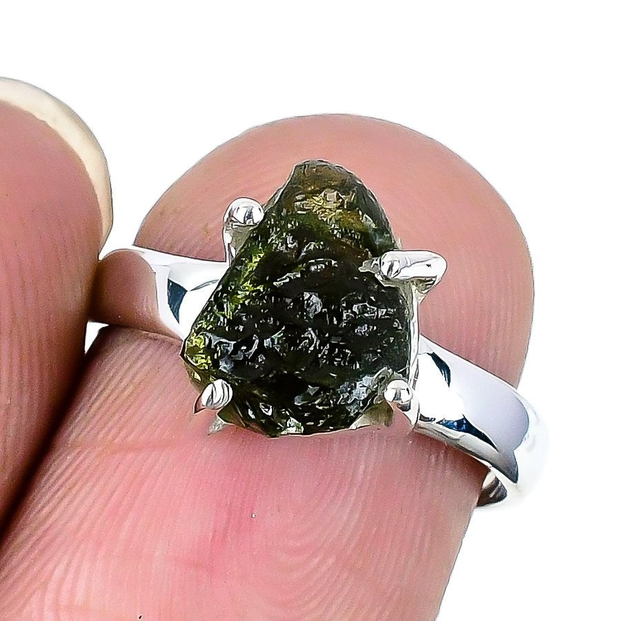 Natural Moldavite 925 Sterling Silver Anniversary Statement Ethnic Ring Jewelry