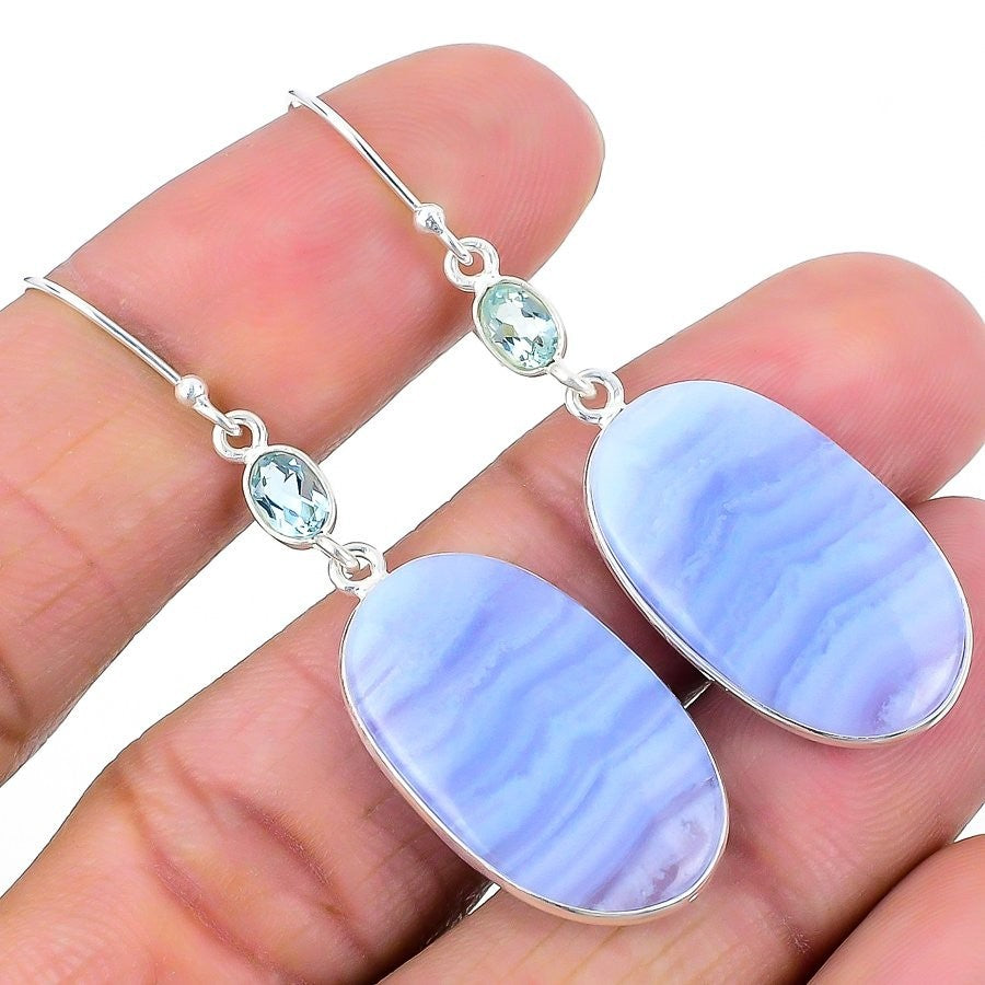 Blue Lace Agate Gemstone 925 Silver Drop Third Eye Chakra Daughter Gift Earrings