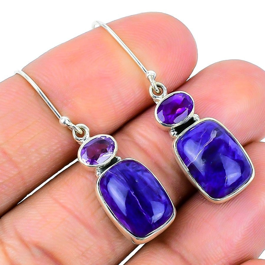 Natural Russian Charoite 925 Sterling Silver Drop Wedding Boho Earrings Jewelry