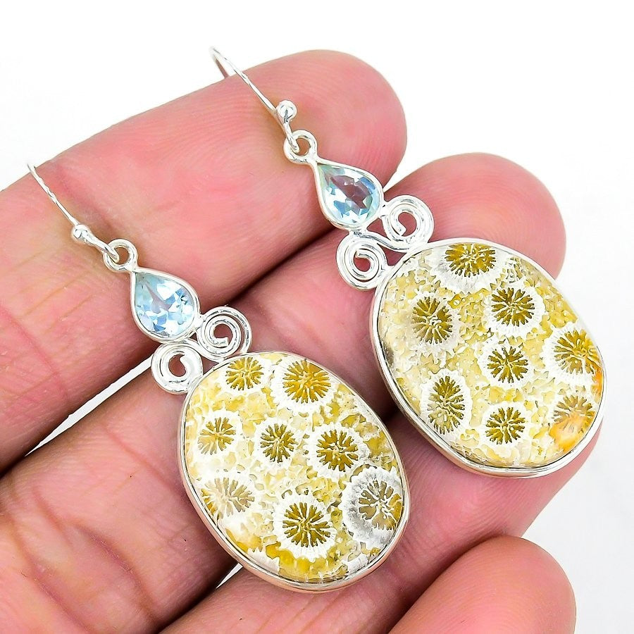 Fossil"Coral Gemstone Solid Silver Art Deco Wedding Dangling Hook New Earrings
