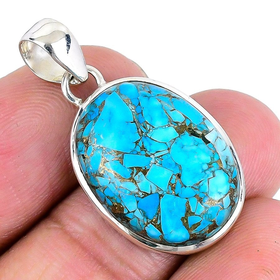 December Birth Copper Blue Turquoise Stone Sterling Silver Bezel Wife Pendant