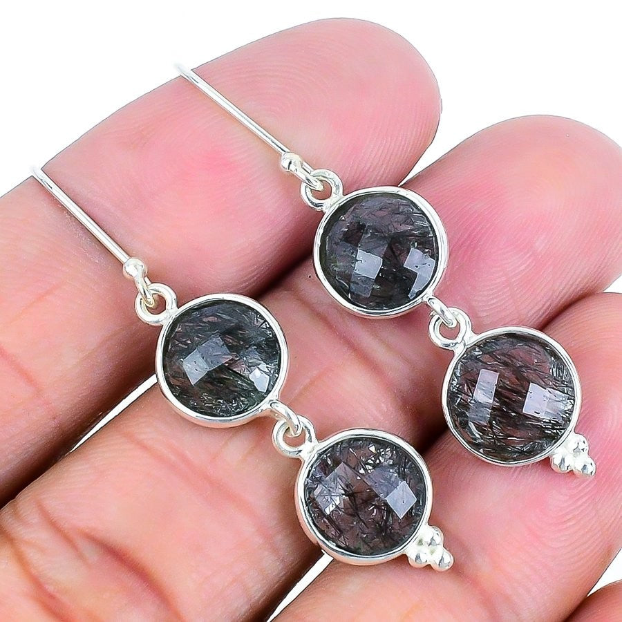 Black Rutile Gemstone Hook Unique Drop Dangle Earrings Jewelry Sterling Silver