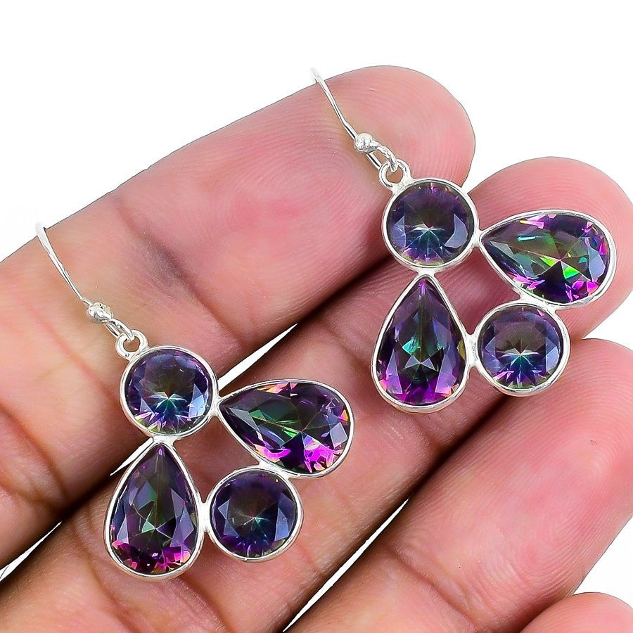 Natural Mystic Topaz 925 Silver Wife Unique Bezel Dangle Art Deco Hook Earrings