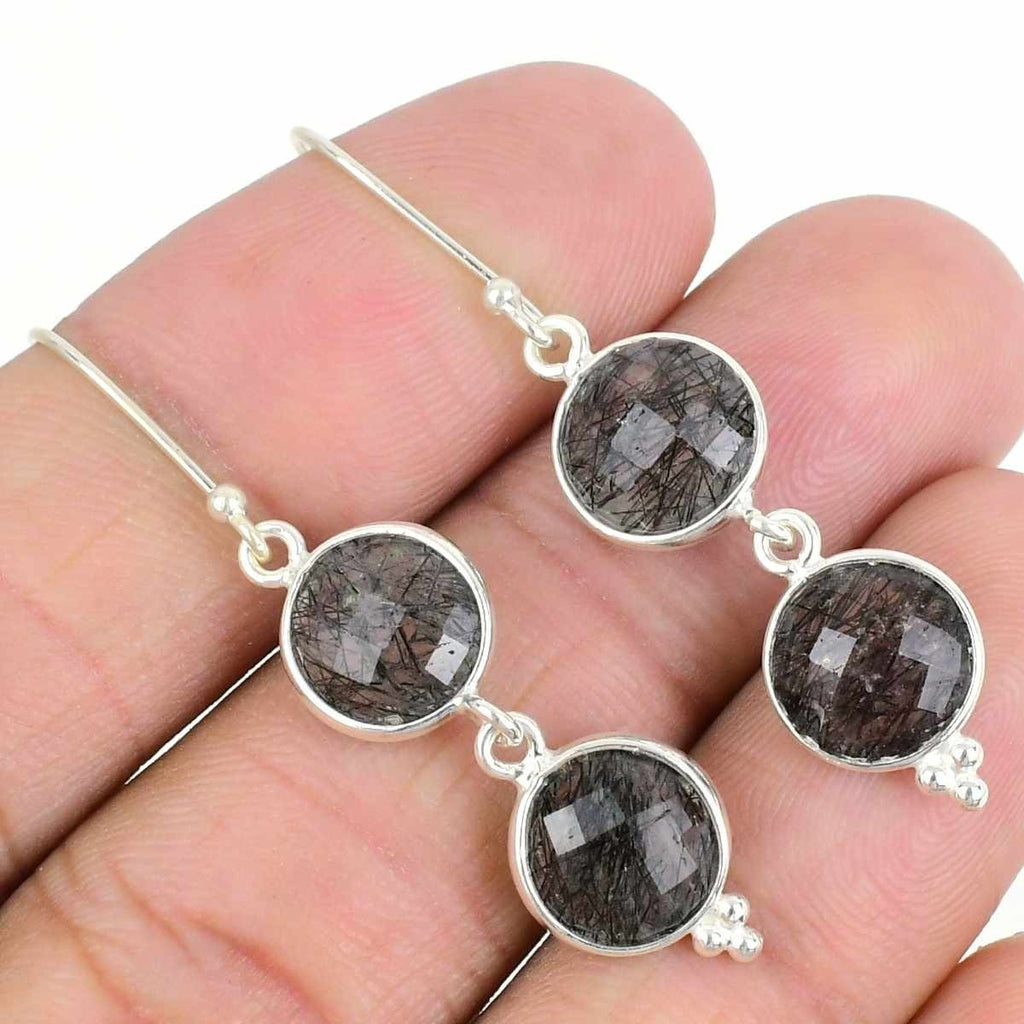 Black Rutile Gemstone Hook Elegant Dangle Drop New Earrings 925 Sterling Silver