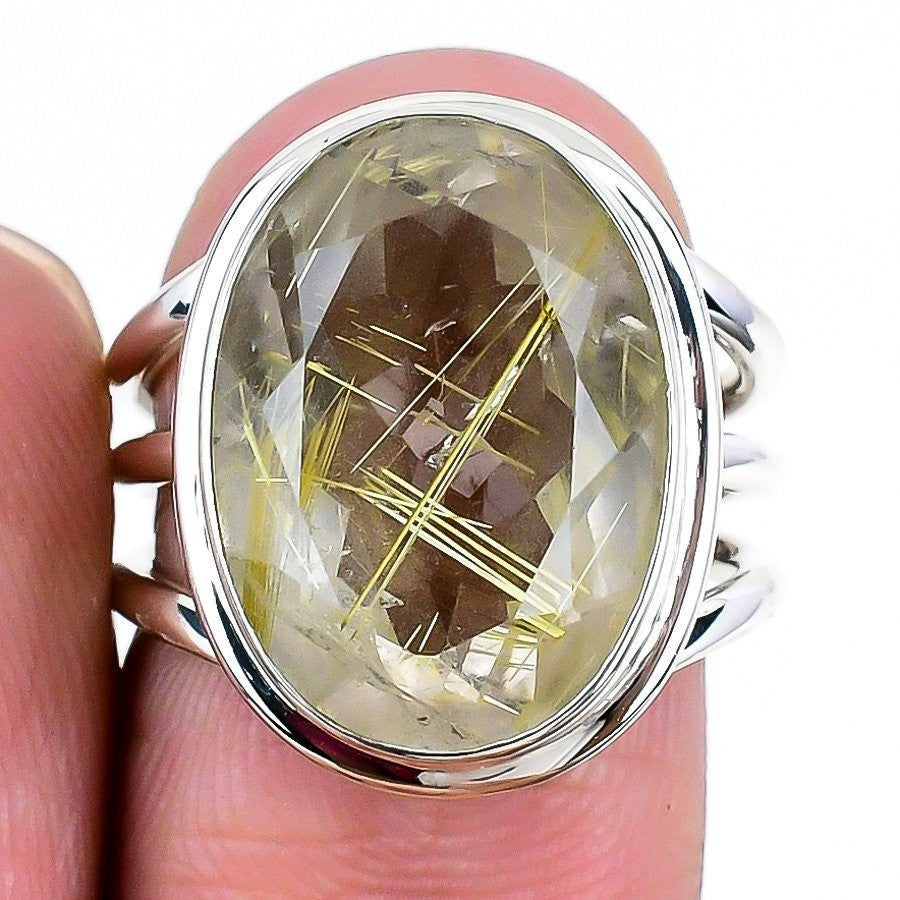 Natural Golden Rutile Faceted Solid Sterling Silver Statement New Ring Size 8