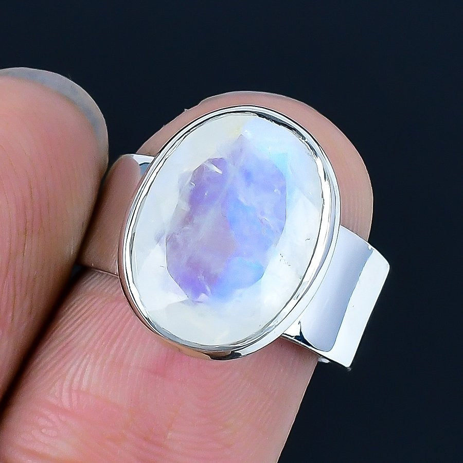 Rainbow Moonstone Faceted Gemstone Sterling Silver Statement Ring Jewelry US 7.5