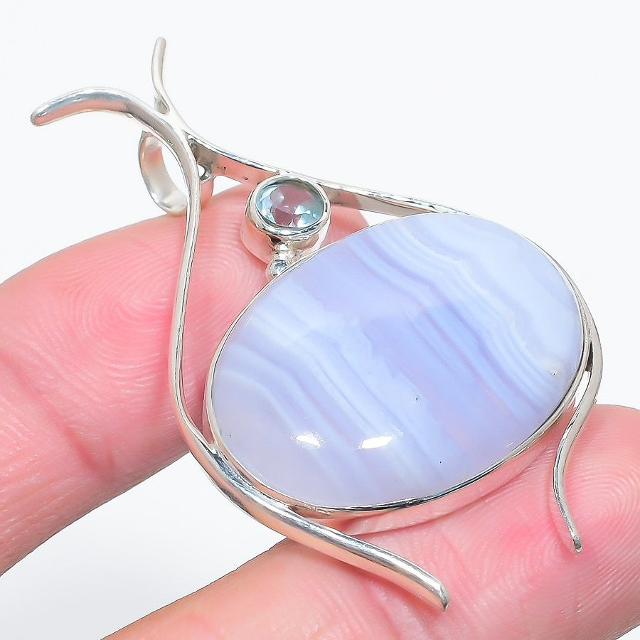 Blue Lace Agate Stone Sterling Silver Best Daughters Gift Wife Art Deco Pendant