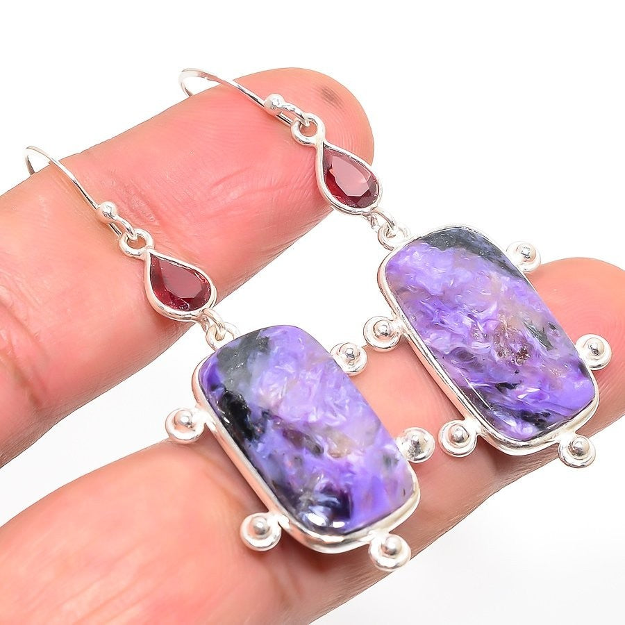 Natural Russian Charoite 925Ā SolidĀ Silver Dangle Sister Wedding Earrings Jewelry