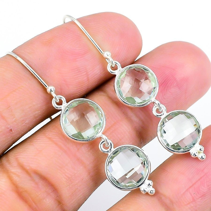 Natural Green Amethyst Solid Silver Trendy Dangling Sister Hook Earrings Jewelry
