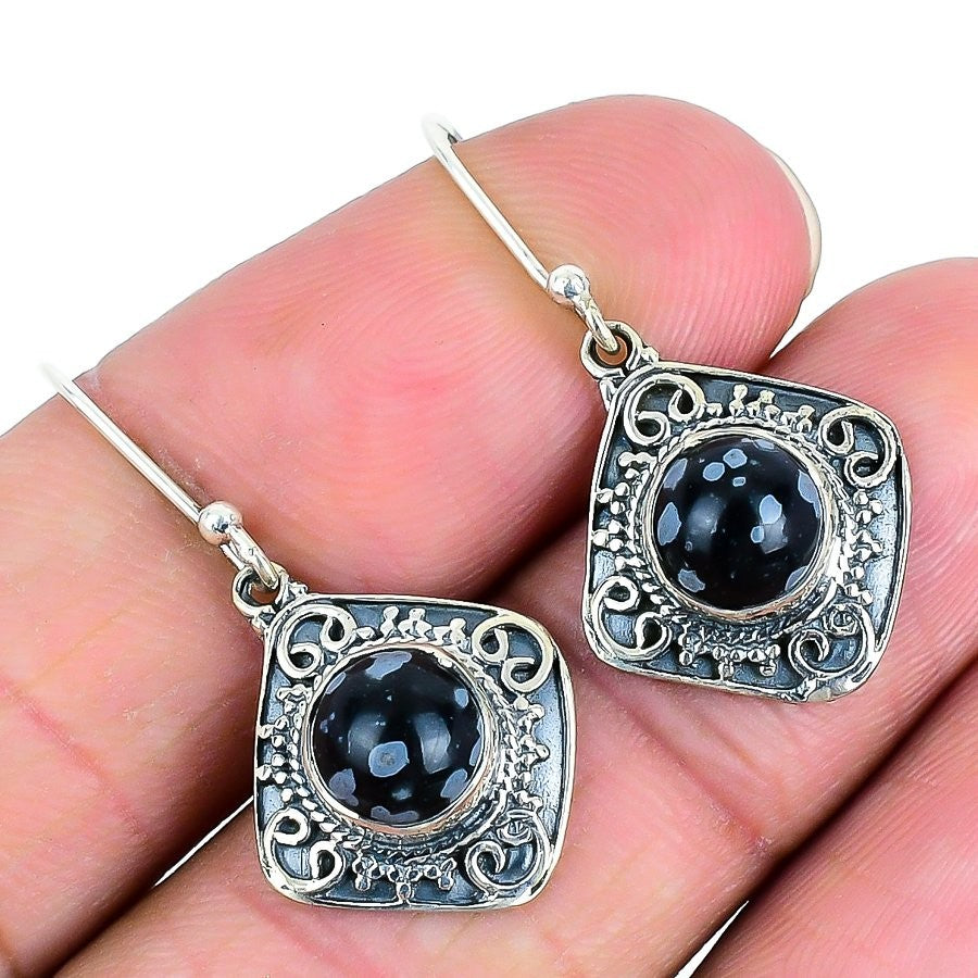 Snoflake Obsidian Gemstone Solid Sterling Silver Drop Dangle Earrings Jewelry