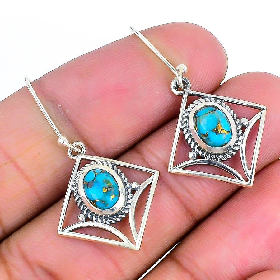 Copper Blue Turquoise Gemstone 925 Silver Elegant Dangle Hook Earrings Jewelry