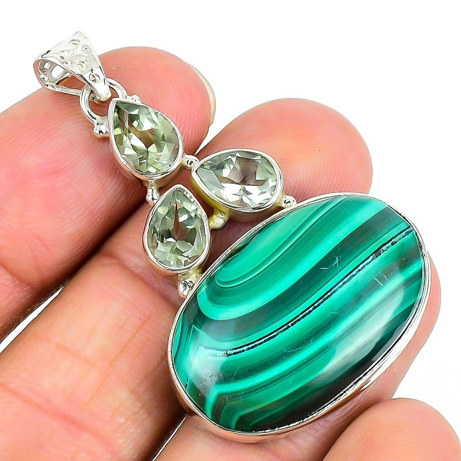 Malachite Stone Sterling Silver Handcrafted Heart Chakra Elegant Pendant Jewelry
