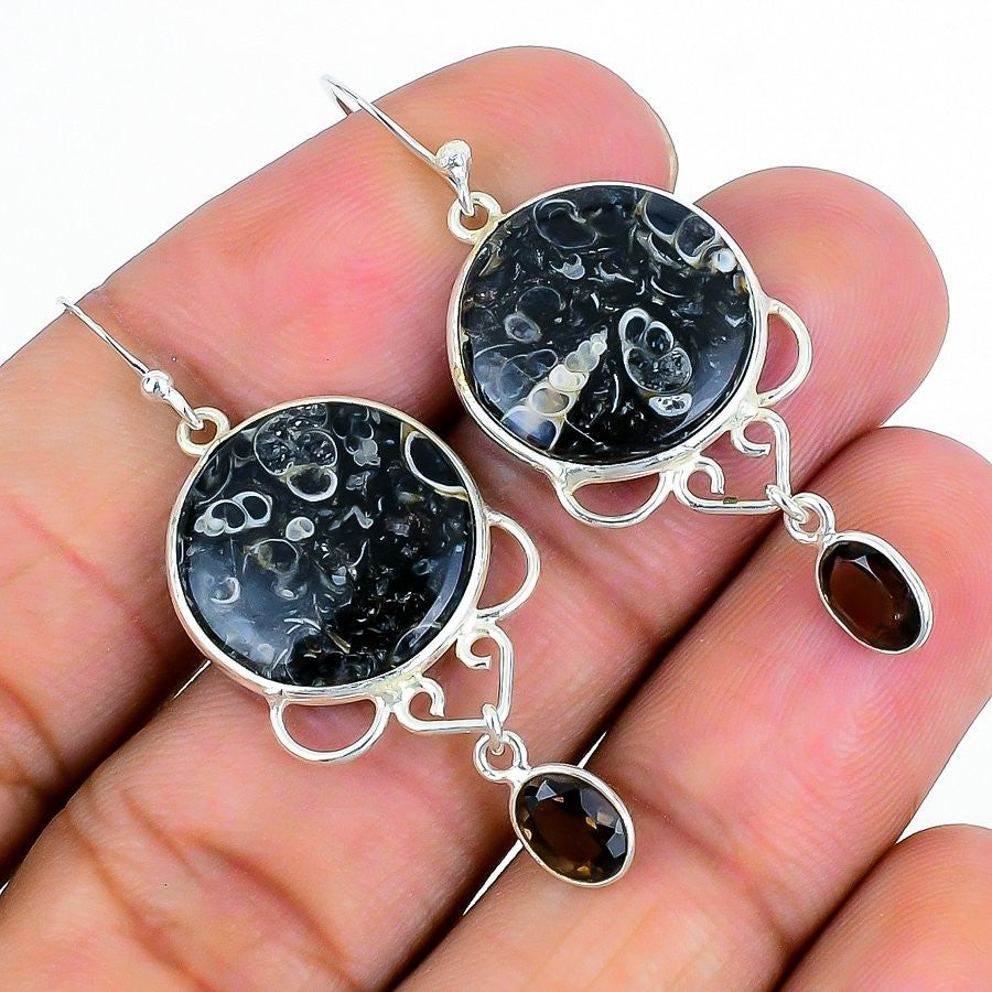Turtilla Fossil Gemstone 925 Silver Handcrafted Hook Dangle New Earrings Jewelry