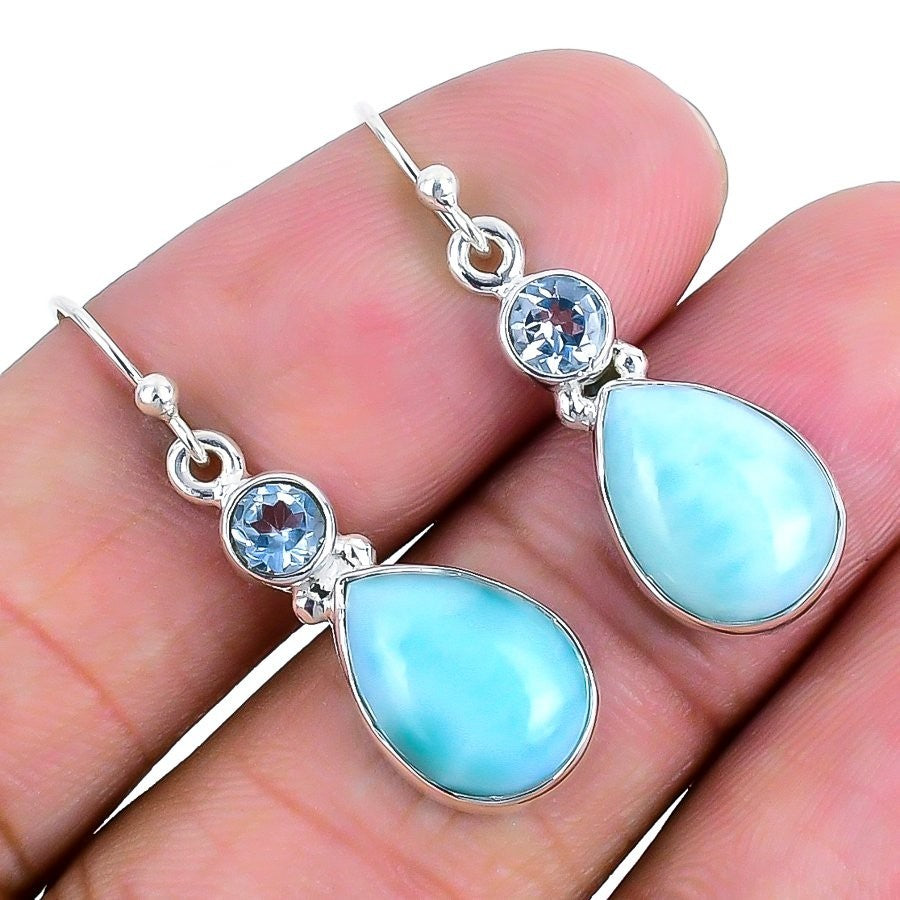 Larimar Stone Drop Dangle Bezel Mother Throat Chakra Hook Earrings 925 Silver