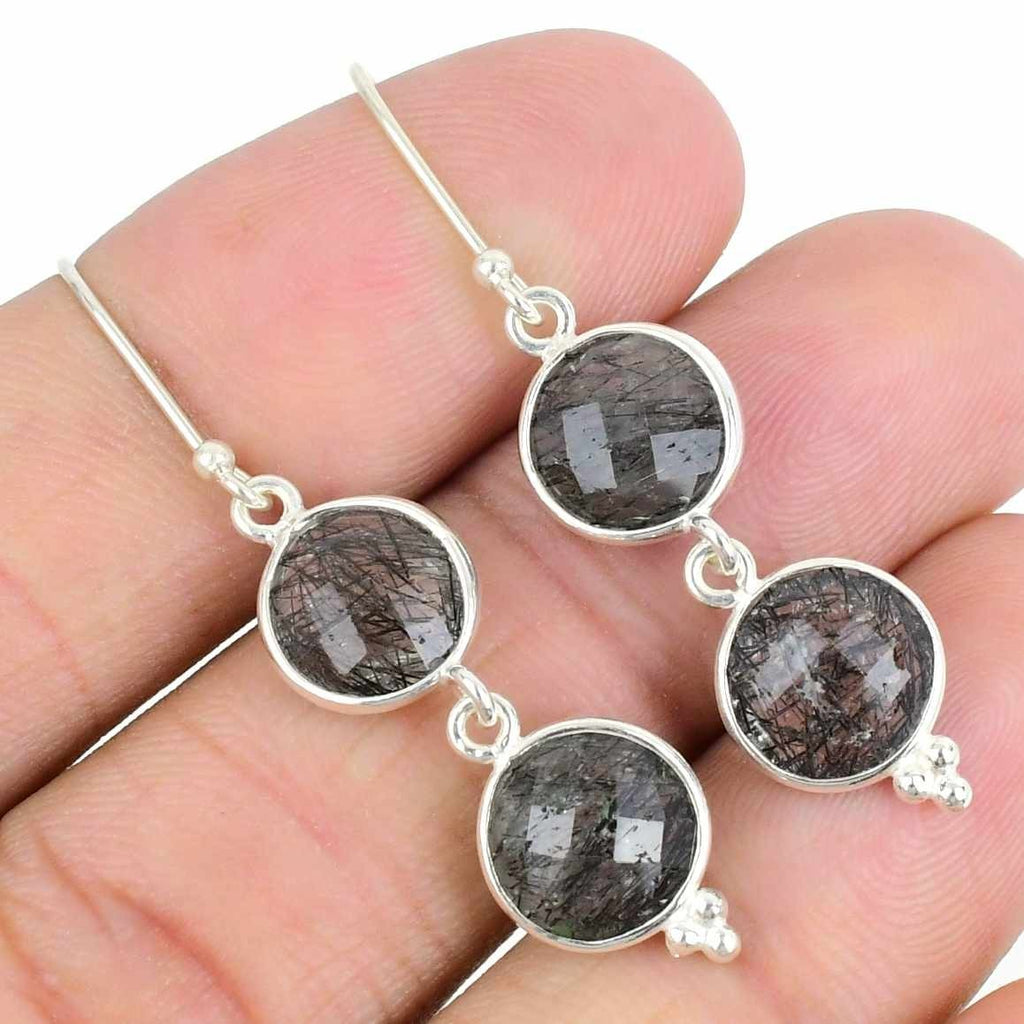 Natural black Rutile 925 Sterling Silver Boho Dangle Drop Handcrafted Earrings