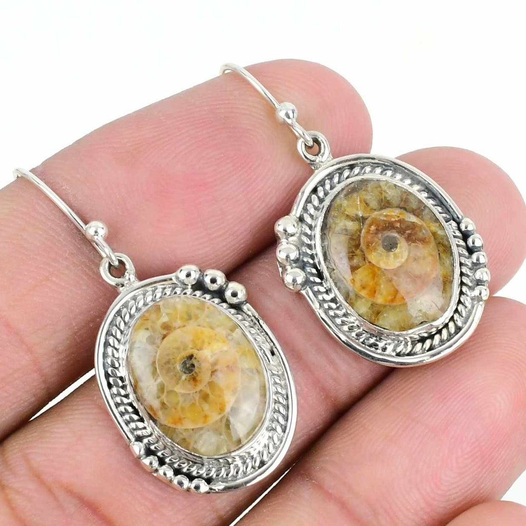 Daughters Day Deal Natural Ammonite Fossil Solid Silver Dangling Hook Earrings
