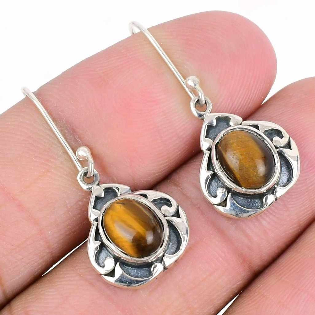 Natural Tiger Eye Sterling Silver Elegant Hook Drop Art Deco Earrings Jewelry