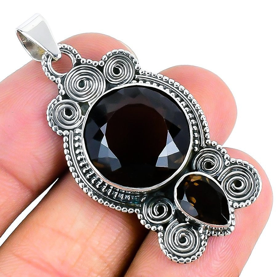 Smoky Topaz Gemstone Handcrafted Wife Ethnic Art Deco Pendant 925Ā SolidĀ Silver