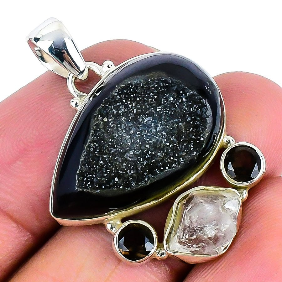 Black Druzy Gemstone Solid Silver Sister Bezel Trendy Elegant Engagement Pendant