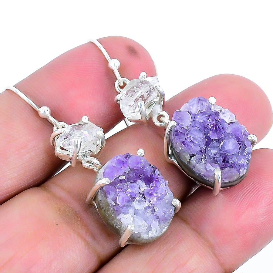 Amethyst Druzy Stone 925Ā SolidĀ Silver Dangling Butterfly Daughter Gift Earrings