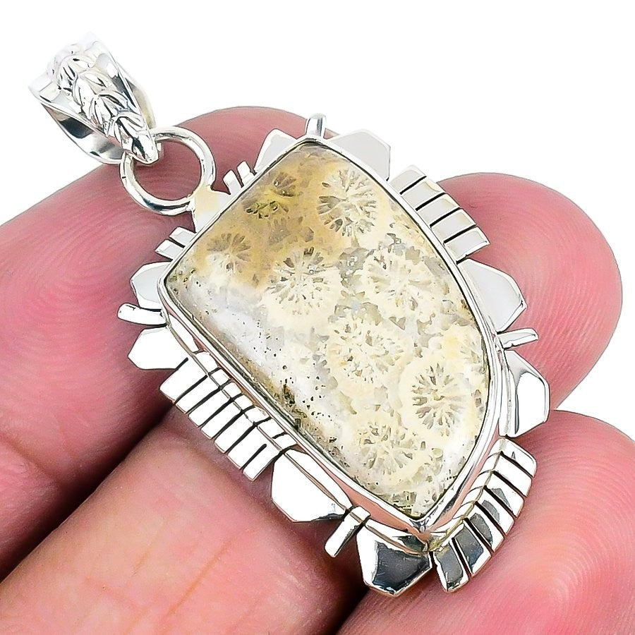 Natural Fossil Coral 925Ā SolidĀ Silver Root Chakra Birthday Boho Pendant Jewelry
