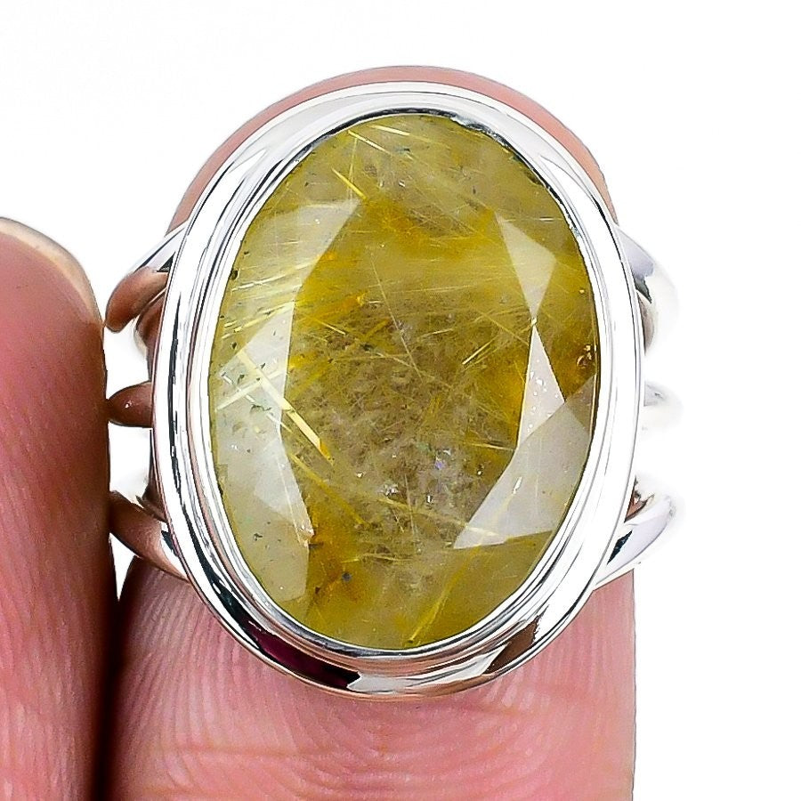 Golden Rutile Faceted Stone Solid Sterling Silver Statement Ring Jewelry US 8.5