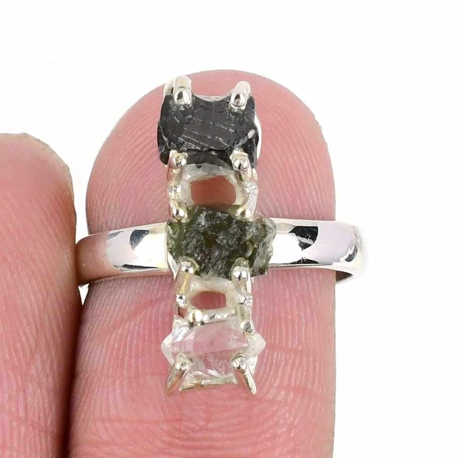 Moldavite Shungite Gemstone Solid Silver Cluster Unique Engagement Ring Size 7