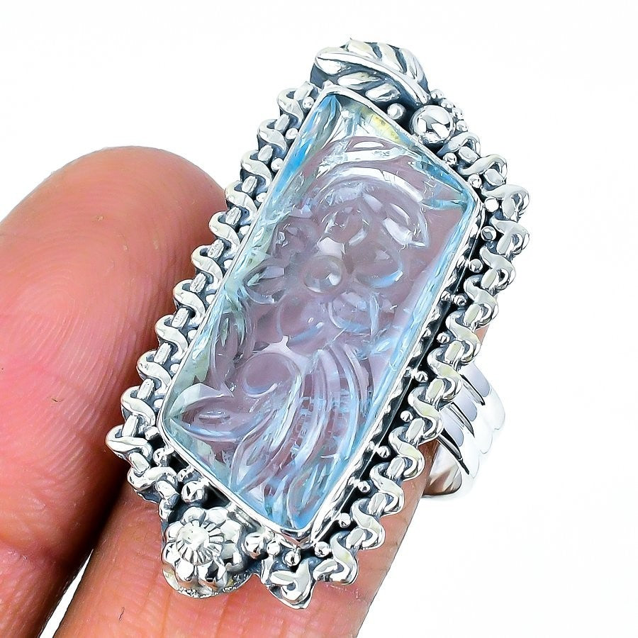 Aquamarine Carving Gemstone Statement Daughters Day Ring 925Ā SolidĀ Silver US 9.5