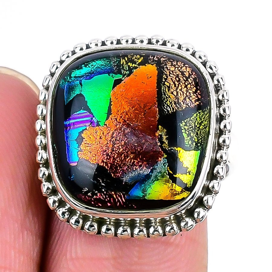 Mexican Dico Glass Gemstone 925 Sterling Silver Boho Statement Ring Jewelry US 8