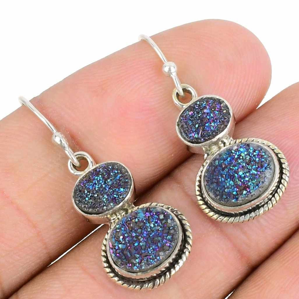 Titanium Aura Druzy Stone Solid Silver Mother Drop Dangle Elegant Hook Earrings