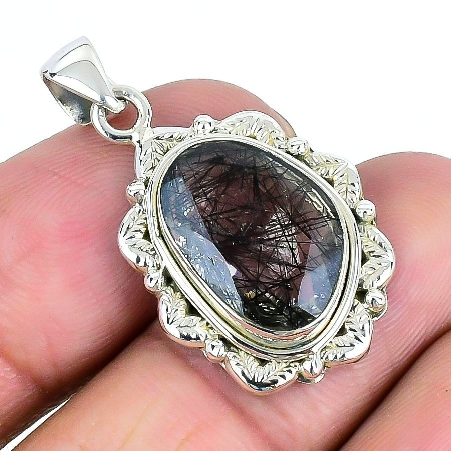 Daughters Day Deal Black Rutile Gemstone Solid Sterling Silver Pendant Jewelry
