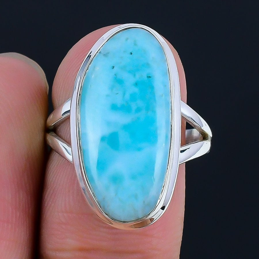 Natural Larimar 925 Silver Boho Statement Daughter Gift Bezel Ethnic Ring Size 8