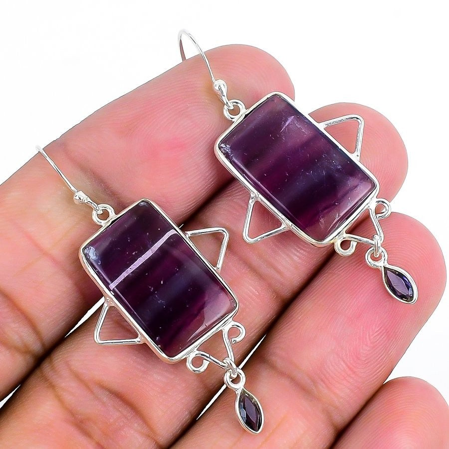 Fluorite Gemstone 925 Sterling Silver Bezel Drop Dangle Wedding Earrings Jewelry