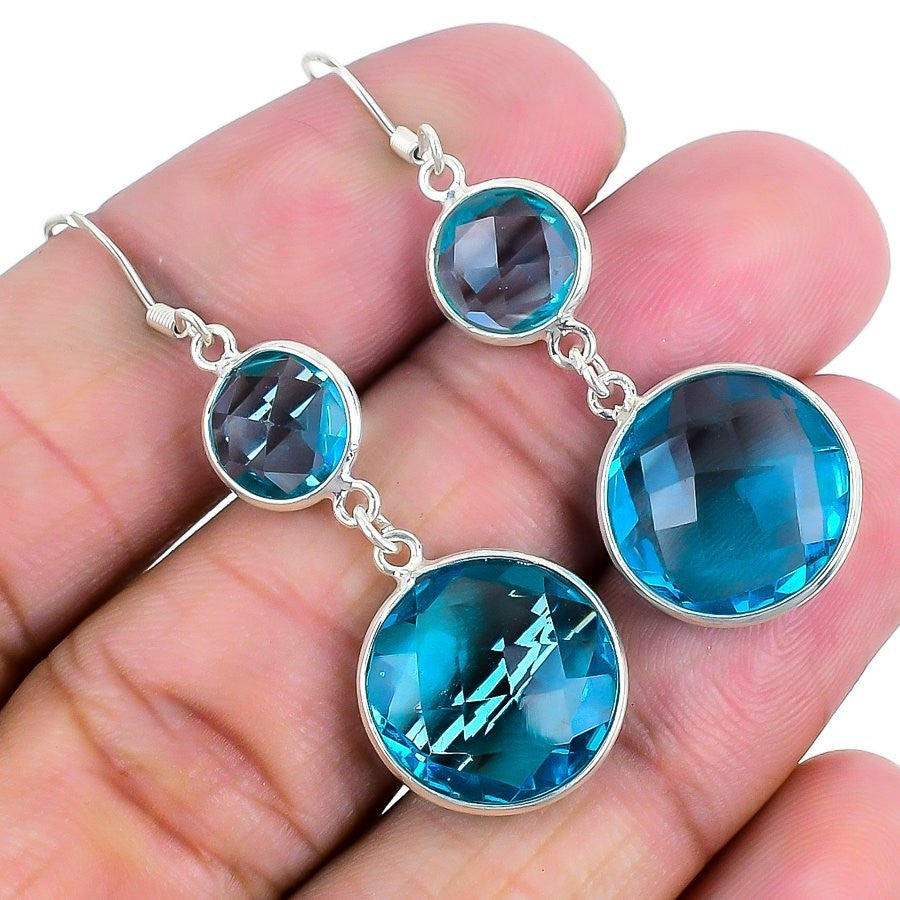 Blue Topaz treated Gemstone Dangle Bezel Ethnic Earrings Jewelry Sterling Silver