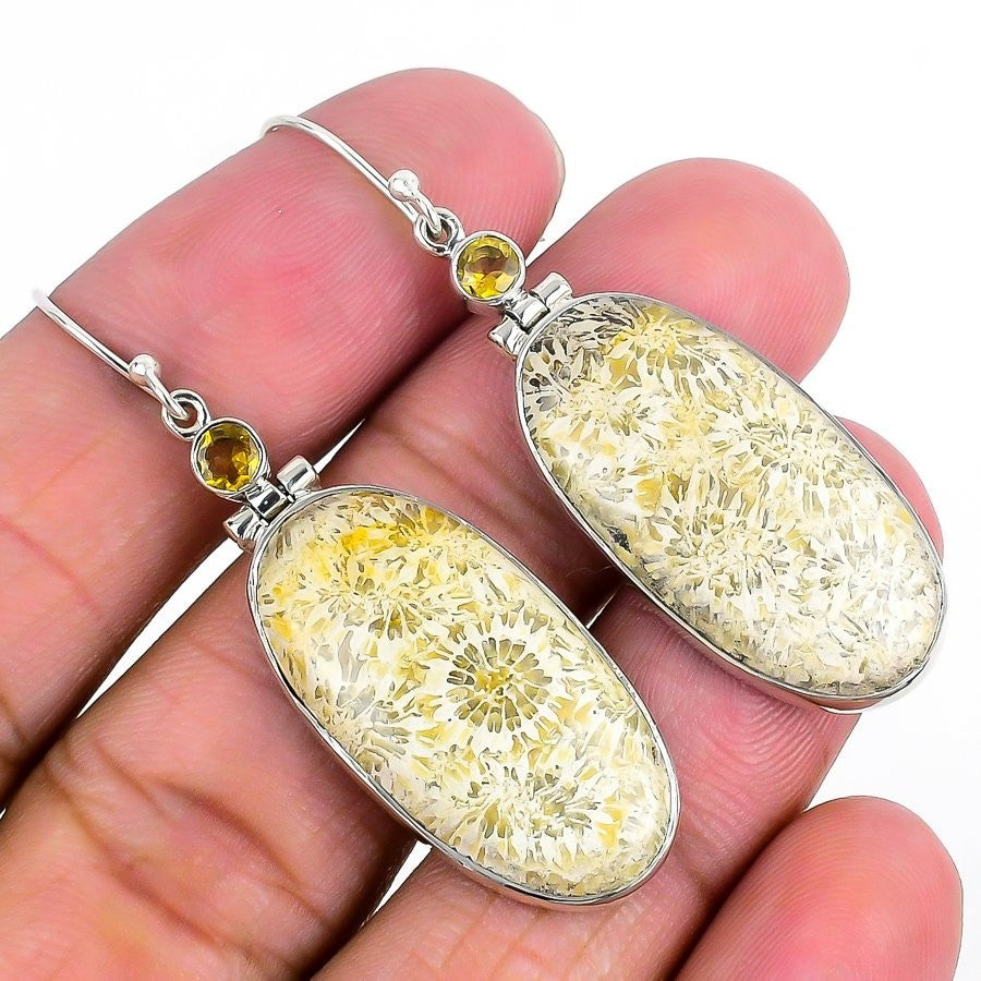 Fossil Coral Gemstone Solid Silver Daughter Art Deco Dangle Bezel Hook Earrings