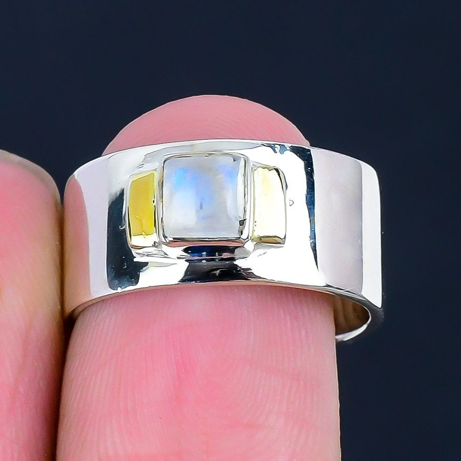 Natural Rainbow Moonstone Elegant Statement Engagement Ring Solid Silver US 6.5