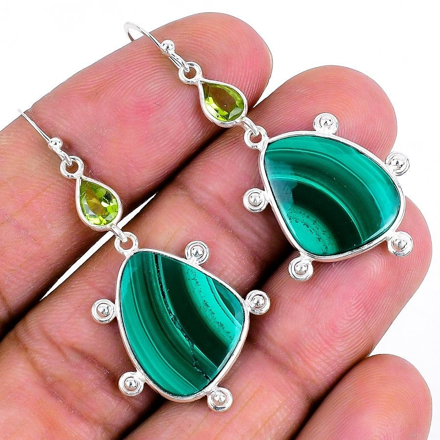 Natural Malachite Solid Sterling Silver Dangling Heart Chakra Earrings Jewelry