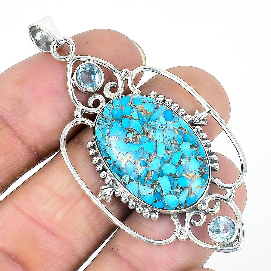Copper Blue Turquoise Stone Solid Sterling Silver Sister Boho Pendant Jewelry