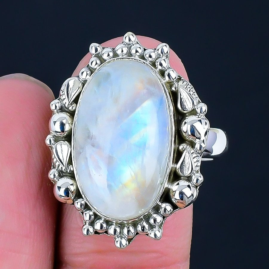 Rainbow Moonstone Stone Cluster Boho Ring Jewelry Size 10 Solid Sterling Silver