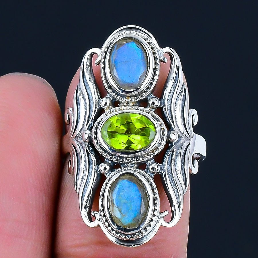 August Peridot Stone Solid Sterling Silver Statement Engagement Boho Ring US 8