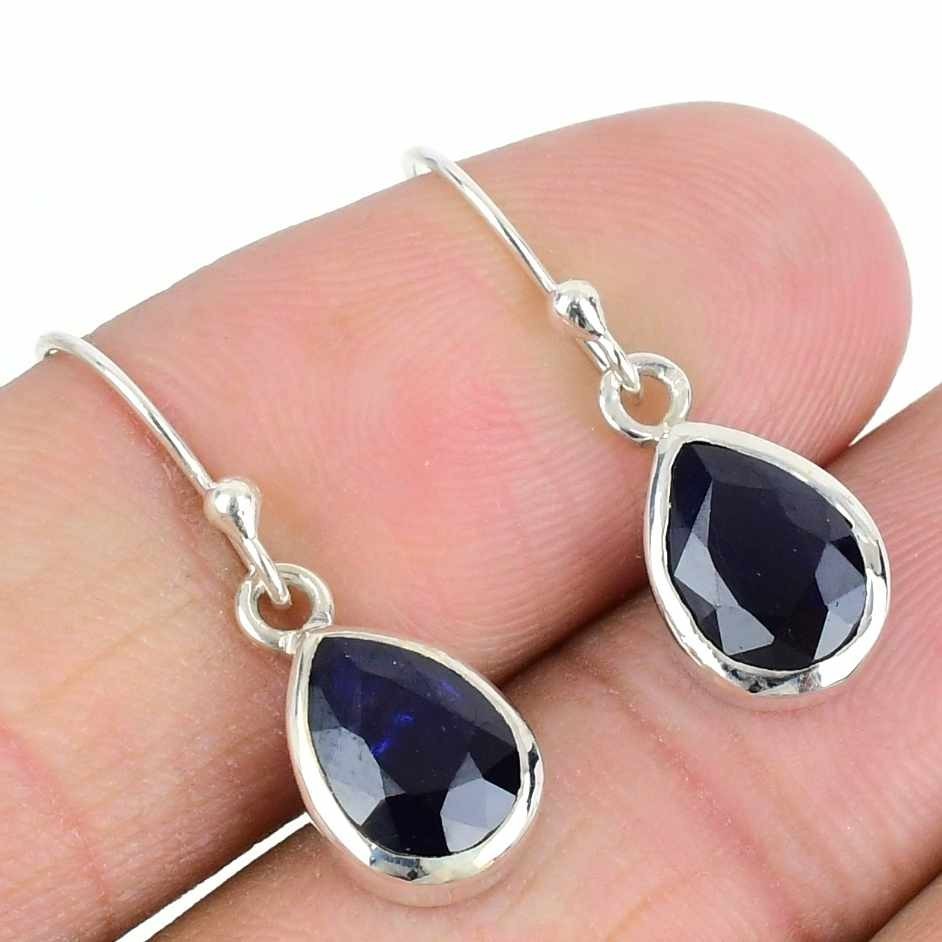 Blue Sapphire Stone Solid Silver Dangle Drop Hook Anniversary Elegant Earrings