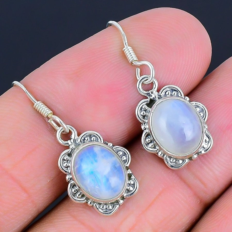 Rainbow Moonstone Gemstone Drop Crown Chakra Hook Earrings Solid Sterling Silver