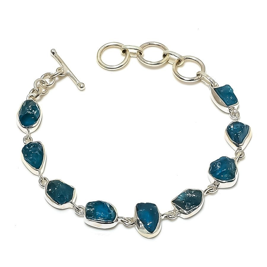 Neon Blue Apatite Stone 925 Silver Engagement Chain Throat Chakra Bezel Bracelet