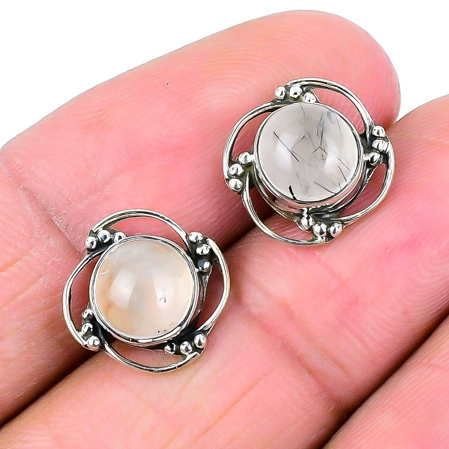 Natural Black Rutile Solid Silver Daughter Stud Post Birthday Wedding Earrings