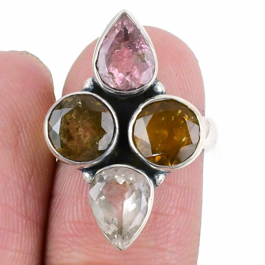 Multi Tourmaline Stone Solid Sterling Silver Cluster Artisan Ring Jewelry Size 8