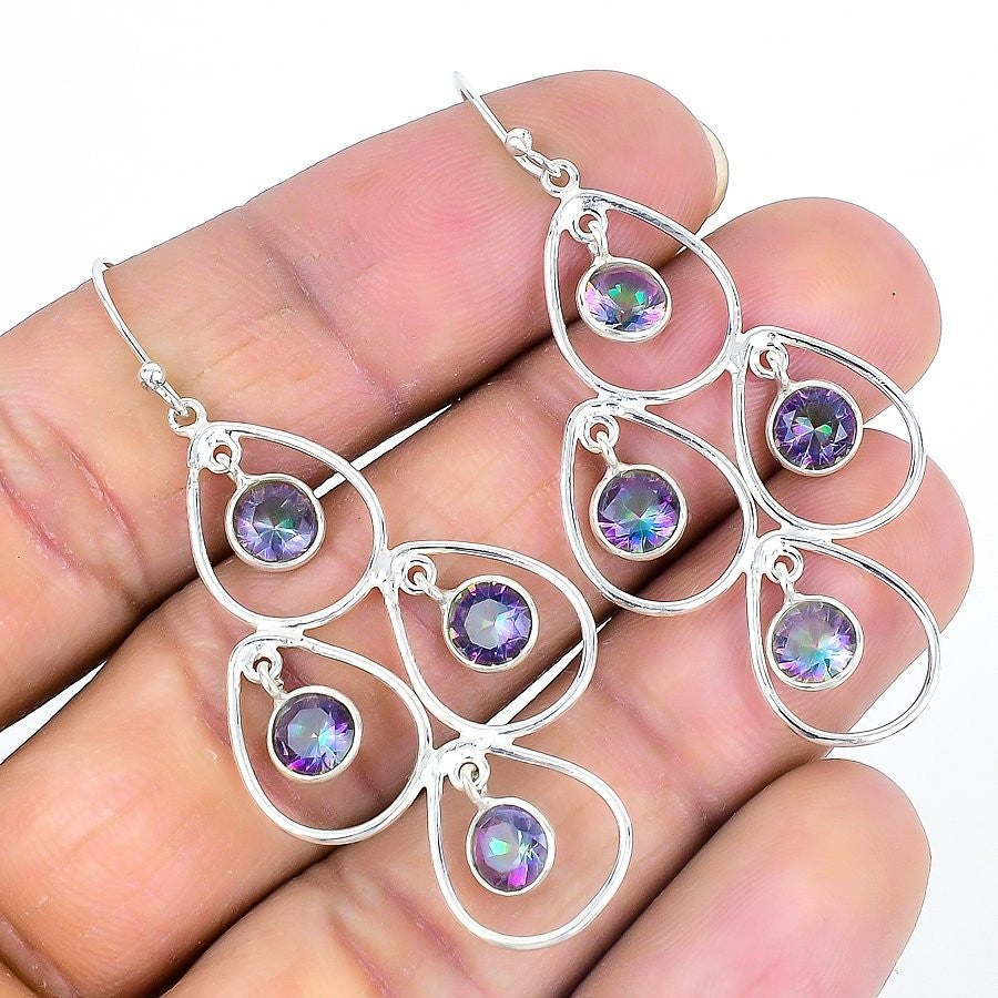 Mystic Rainbow Topaz Gemstone Solid Silver Drop Dangle Daughter Hook Earrings