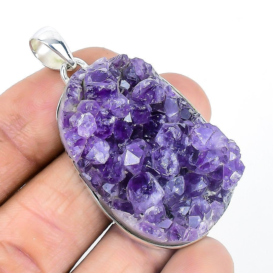 Daughters Day Sale Amethyst Druzy Gemstone Sterling Silver Sister Unique Pendant