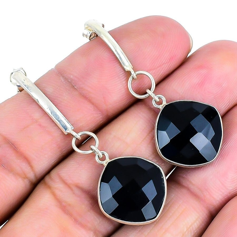 Natural Black Spinel 925 Sterling Silver Bezel Drop Wife Hook Birthday Earrings
