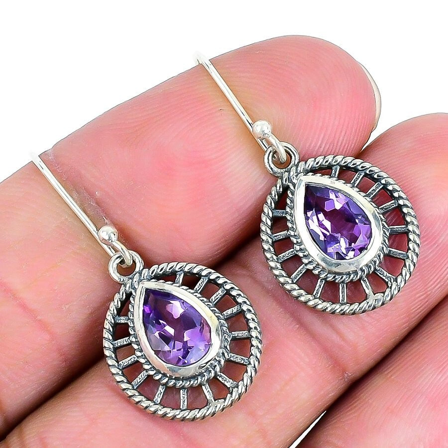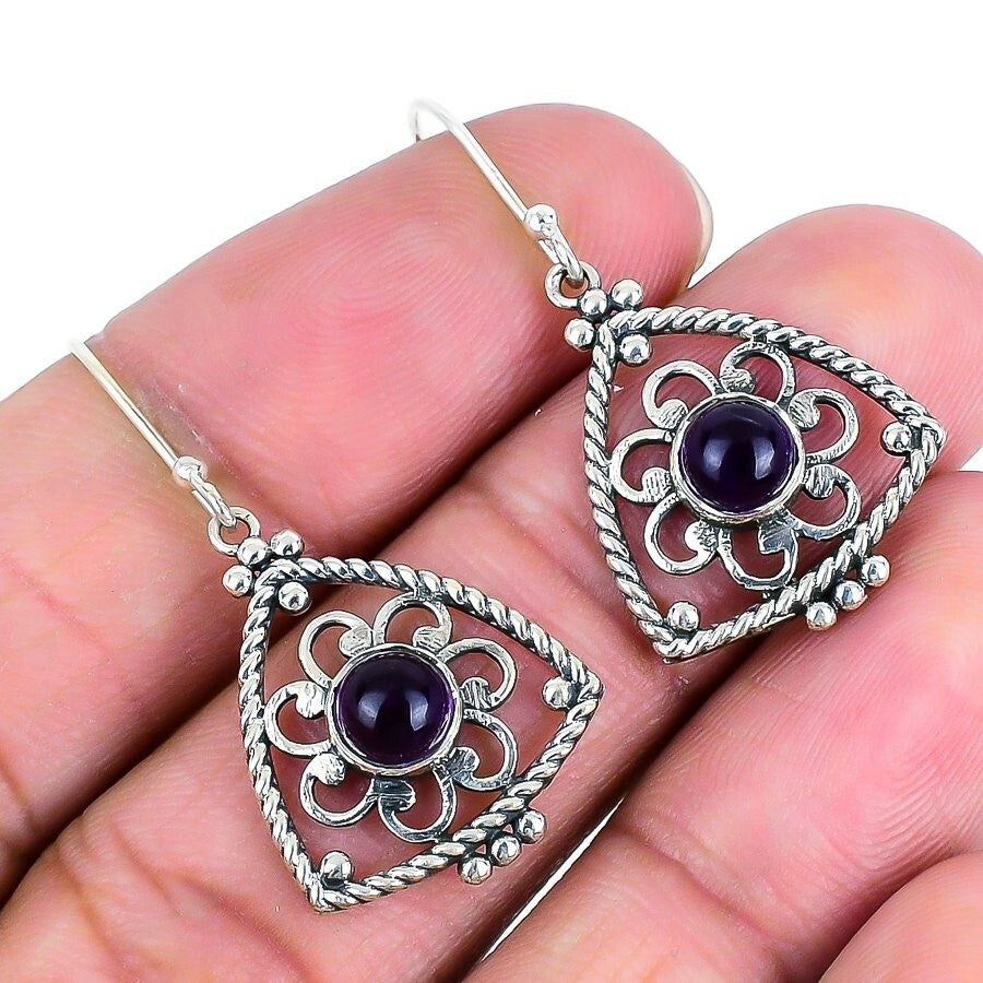 Amethyst Stone Solid Silver Hook Dangling Ethnic Mothers Gift Earrings Jewelry