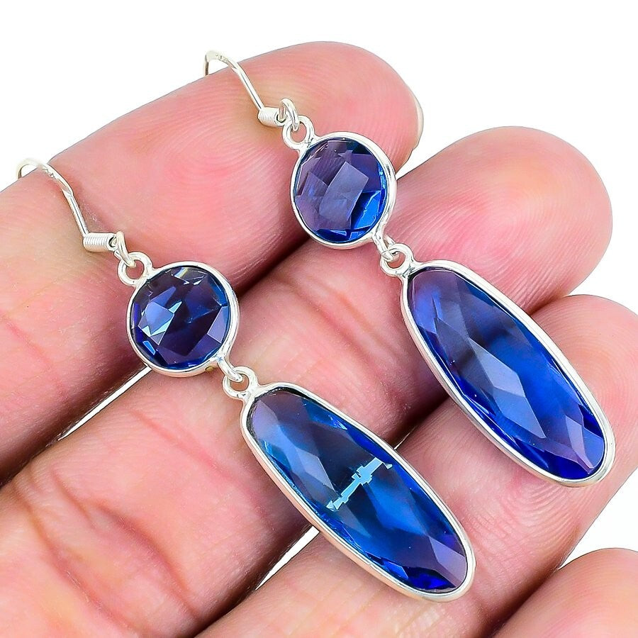 Natural Iolite Treated Glass Sterling Silver Anniversary Dangling Bezel Earrings
